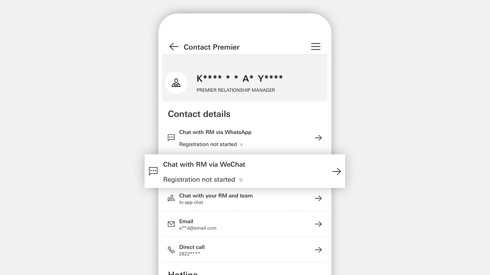 Log on to the HSBC HK App. Select the menu icon, then find 'Contact HSBC Premier Elite' / 'Contact Premier'. Next, choose 'Chat with RM via WeChat'.