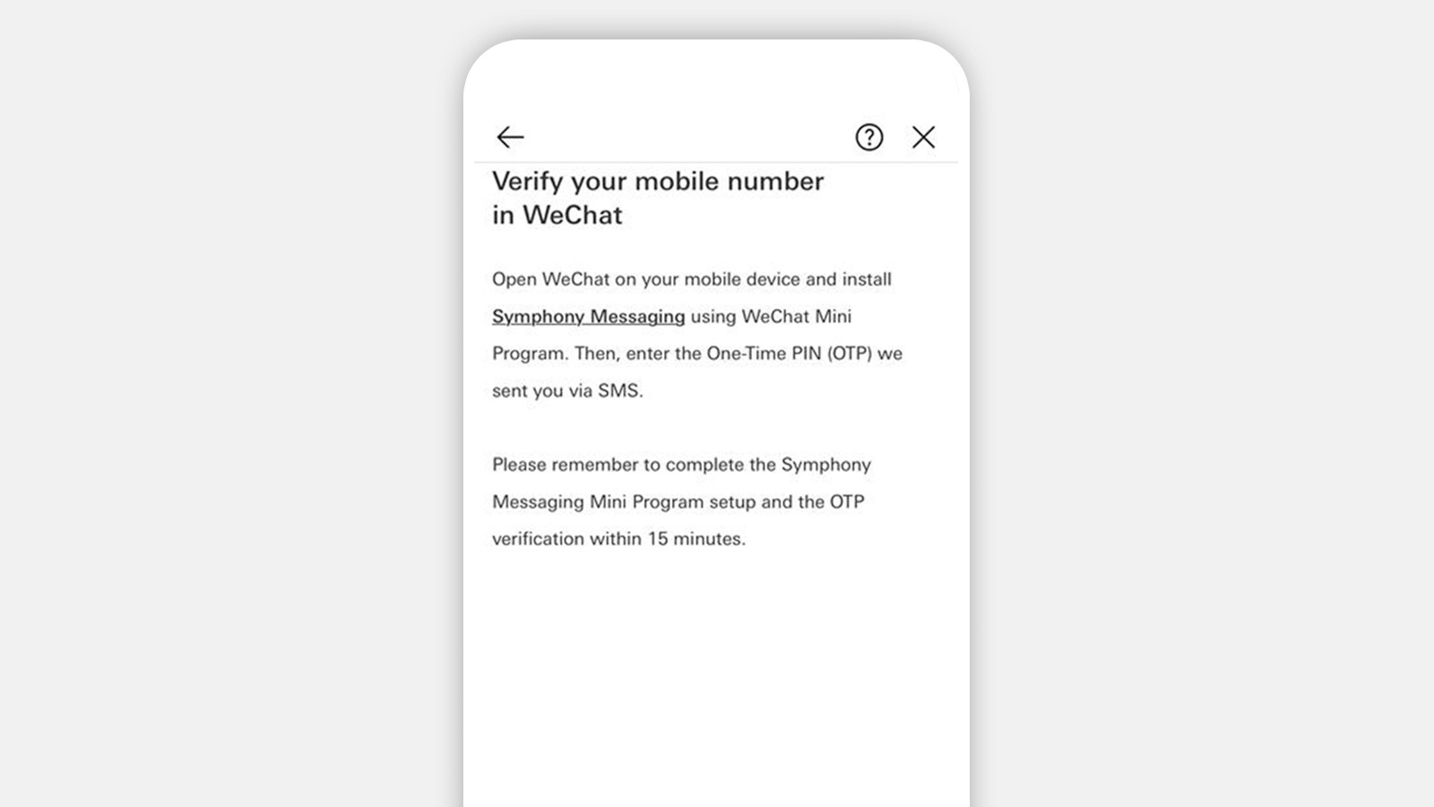 Verify your contact details, then select 'Verify number in WeChat'. Next, open WeChat, go to 'Discover', then search for and install the 'Symphony Messaging' Mini Program. Read and accept the Symphony terms and conditions.