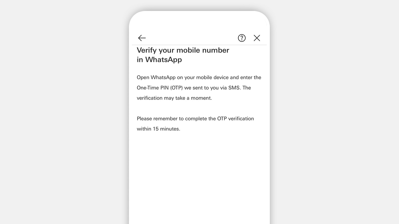 We'll send you a 6-digit One-Time PIN (OTP) via SMS. Enter the OTP in the chat to verify your identity. You must complete the OTP verification within 15 minutes. Once you've done that, you can start chatting with your Relationship Manager and team.