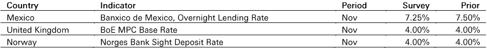 In the UK, the Bank of England is expected to keep the benchmark rate unchanged at 4.00% but further good inflation news could prompt a rate cut in December.