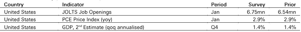 In the US, job openings should rise to 6.75mn in January, after December's sharp fall. The quits rate is relatively stable, consistent with modest wage growth. Meanwhile, the PCE Price Index is expected to remain at 2.9% yoy in January, given the latest solid PPI data and January's CPI. Little change is envisaged in the estimate of Q4 GDP. Consumer spending moderated in late 2025.