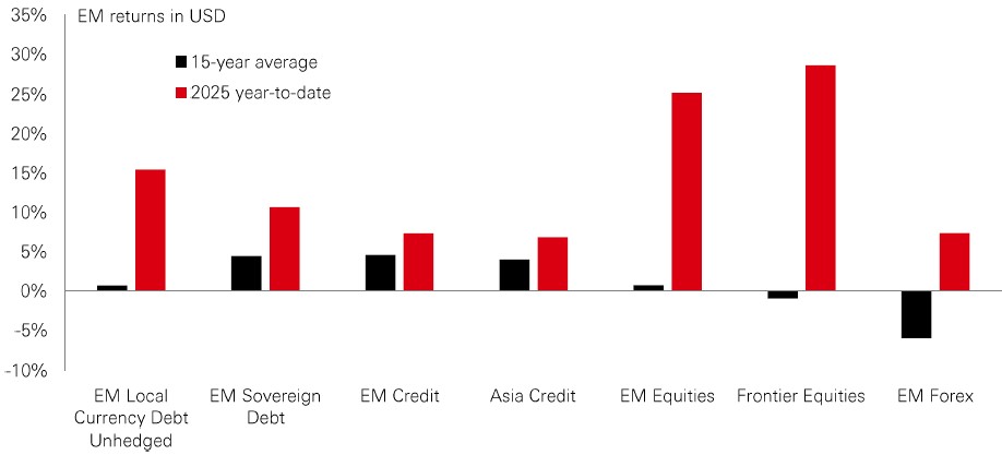 2025 has offered emerging market believers plenty of bragging rights. After surviving largely unscathed from the most aggressive Fed tightening cycles in decades, EM asset classes have delivered a stellar performance this year, helped by a big drop in the US dollar and continued policy easing in many individual EMs. But is the rally just about the favourable external environment, or could something more fundamental be driving the renewed investor interest in EMs?
