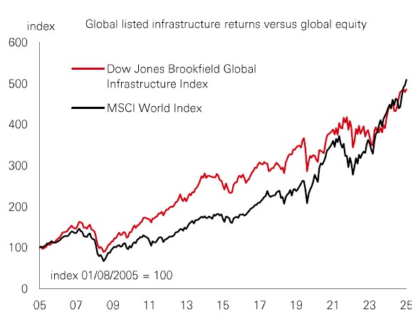 As a defensive, longer-duration asset class, listed infrastructure has faced headwinds from high rates in recent years. But in the first three quarters of 2025, returns have been strong – with the Dow Jones Brookfield Global Infrastructure index up by 13%. Some listed infrastructure analysts think a mix of strong structural drivers and global policy easing – including US rate cuts – could signal the start of a multi-decade investment cycle. It’s being driven by shifting trends in demographics, energy demand, and digitalisation, which are leading governments to prioritise policy support in areas like electrification (including renewables), AI and data centres, and telecoms. Yet, for investors, infrastructure sector valuations remain potentially compelling. |