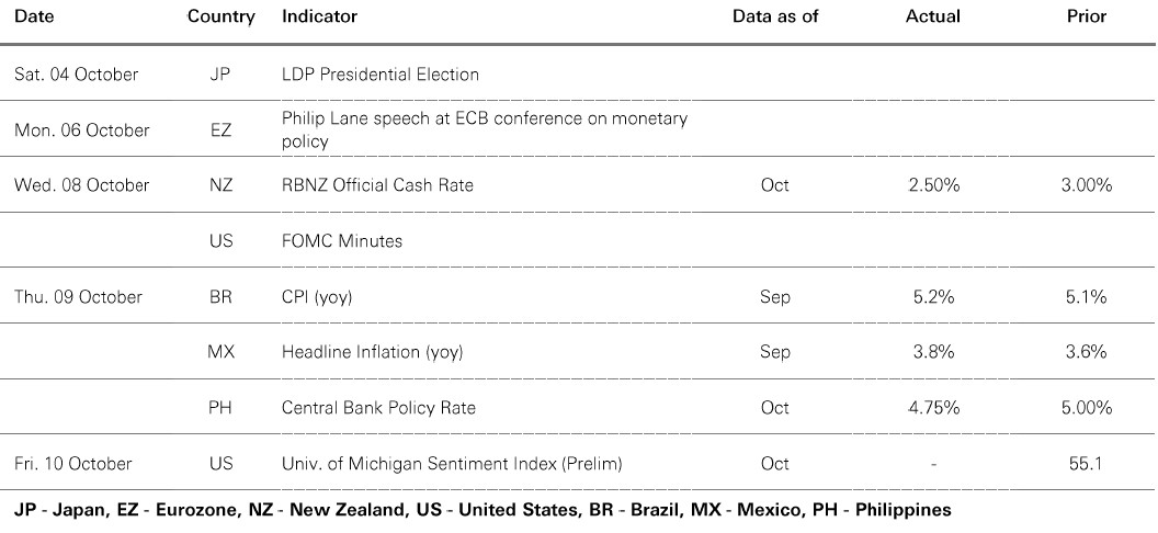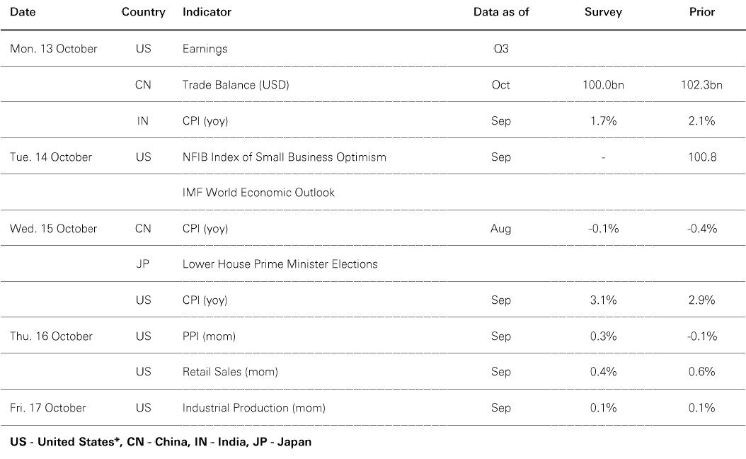Source: HSBC Asset Management. Data as at 7.30am UK time 10 October 2025. For informational purposes only and should not be construed as a recommendation to invest in the specific country, product, strategy, sector or security. Any views expressed were held at the time of preparation and are subject to change without notice. Any forecast, projection or target where provided is indicative only and is not guaranteed in any way. *The ongoing government shutdown in the US may delay the expected releases of official data