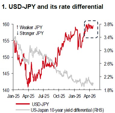 Our base case remains for USD-JPY to decline by year-end. Near-term upside risks include a more dovish BoJ, a more hawkish Federal Reserve (Fed), escalation in the Middle East conflict and renewed oil-price highs, and further fiscal slippage in Japan.