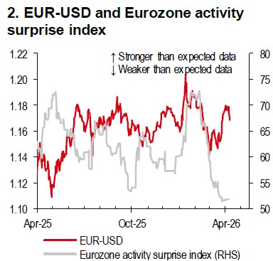 Turning to the EUR, Middle East developments have been the key driver, but cyclical factors (such as growth, inflation, and policy response) are likely to determine the magnitude of moves. Eurozone flash composite PMI disappointed in April, with the private sector returning to contraction for the first time since December 2024. Price components also point to a stagflationary impulse. If disruption around the Strait of Hormuz persists, the negative impact on Eurozone growth and inflation is likely to intensify, undermining the EUR (Chart 2).