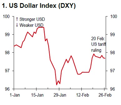 Since the US Supreme Court ruled against the Trump administration’s use of the International Emergency Economic Powers Act (IEEPA) for tariffs on 20 February, USD volatility has remained fairly muted (Chart 1). This was widely expected, given earlier signs of judicial scepticism. However, US policy uncertainty persists, especially with President Trump’s recent global tariff announcements, which could weigh on the USD and trigger market moves if major trade developments occur. That being said, the negative sentiment may not be as strong as it was after “Liberation Day” last year.