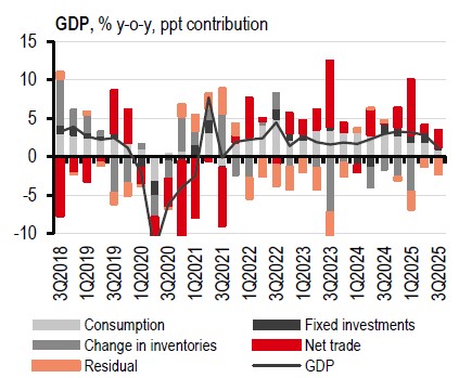 While it may be tempting to attribute this to trade front-loading, the economic strength is actually more broad-based. However, no doubt, trade helps, as net exports reversed to a positive growth contribution in 3Q25. Despite trade volatility, there are two notable trends.