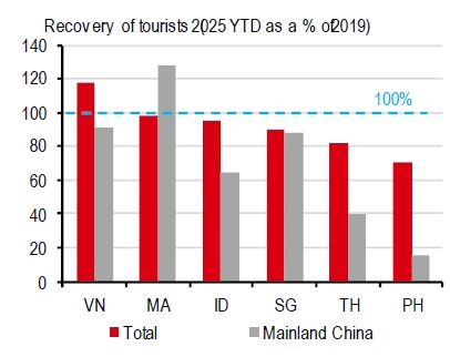 The other tailwind to Malaysia’s retail sales is its booming tourism sector. Malaysia has seen a full recovery in tourism to 2019 levels, just behind Vietnam. In particular, it leads the region in welcoming Chinese tourists, exceeding 20% of their 2019 level. This is aided by a visa-free scheme with China.