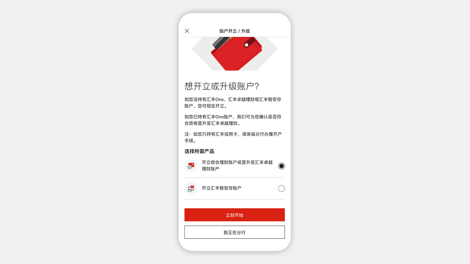 无论您是全新客户,或從现有汇丰One、综合理财或一般储蓄账户晋级,都可通过香港汇丰流动理财应用程序[@premier-apply-via-app],5分钟内快捷开户。