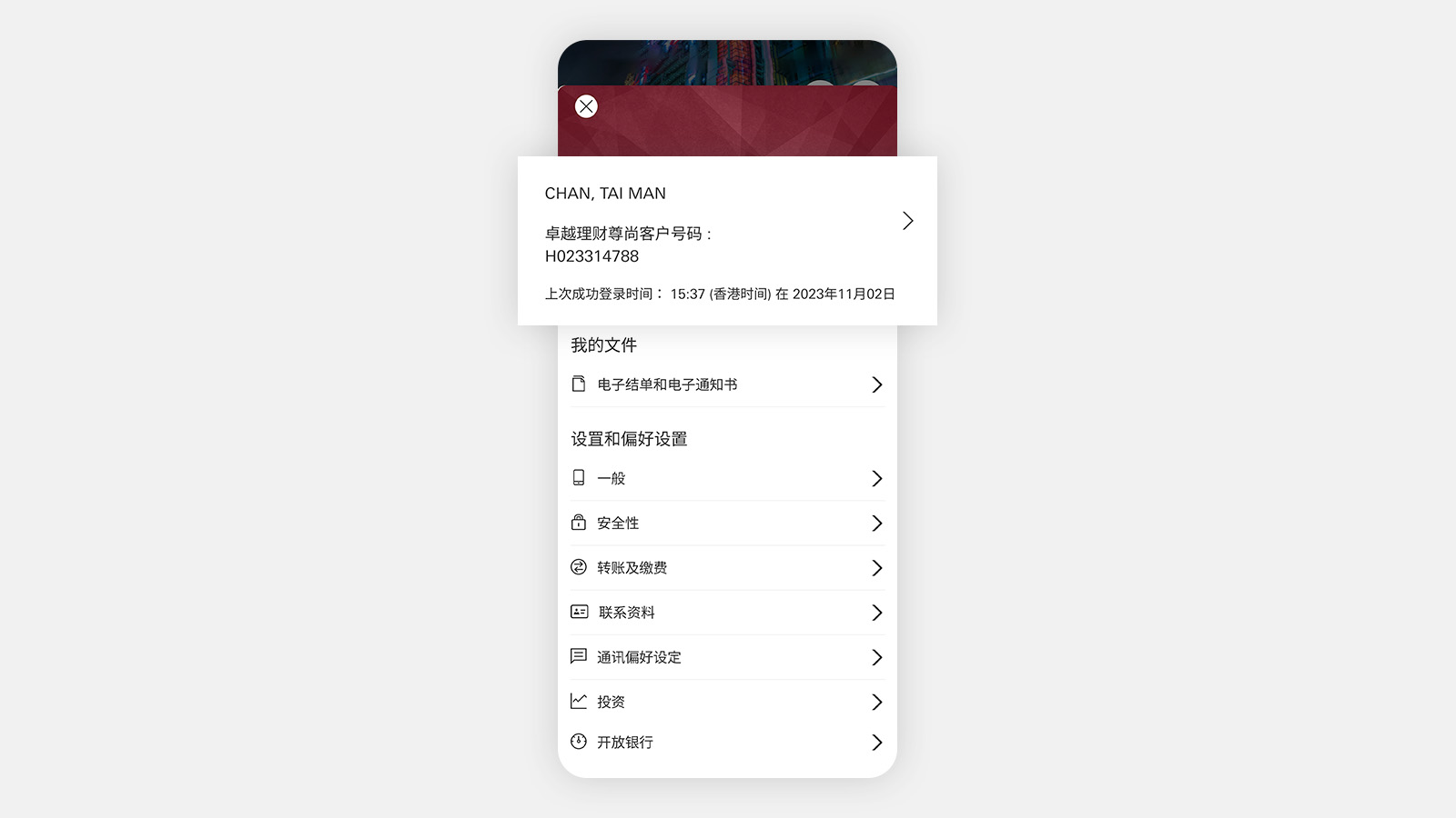 只需登录香港汇丰流动理财应用程序,再前往以下页面,即可查看您的卓越理财尊尚客户号码: