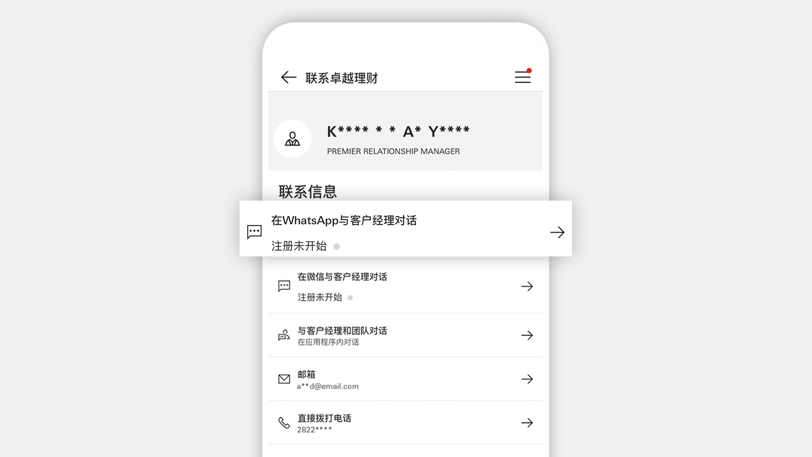 登录HSBC HK App,并点选菜单图标。选择“联系汇丰卓越理财尊尚”或”联系卓越理财”,再选择”在WhatsApp与客户经理对话”。