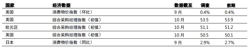 美国9月消费物价指数通胀可能升0.4%(环比),升幅与8月持平。核心消费物价指数可能升0.3%(环比),8月升幅为0.3%(环比)。预期综合采购经理指数将保持在扩张区间,有别于新一轮表现欠佳的供应管理协会调查。
