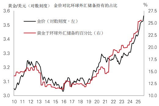今年金价升幅惊人。 年初至今已上升约55%,预期将成为2025年表现最佳的资产类别之一。 此轮升势源于全球央行进一步加快持有黄金,目前全球约四分之一的储备以黄金形式持有。 这主要与地缘政治有关,各国增加黄金储备,寻求在与美国政府关系紧张时,降低在动用储备时出现问题的风险。