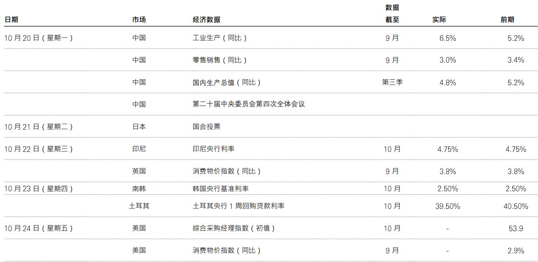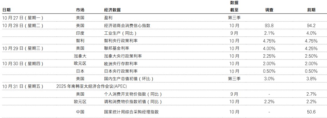 资料来源:汇丰投资管理。 数据截至2025年10月24日(英国时间上午7时30分)。 仅供参考,不应视为投资特定国家、产品、策略、行业或证券的建议。 所表达的任何观点均截至编制为止,如有更改,恕不另行通知。 所提供的任何预测、预计或目标仅供参考,概非任何形式保证。 汇丰投资管理对未能达到该预测、预计或目标,概不承担任何责任。 *美国政府持续停摆可能推迟官方数据公布