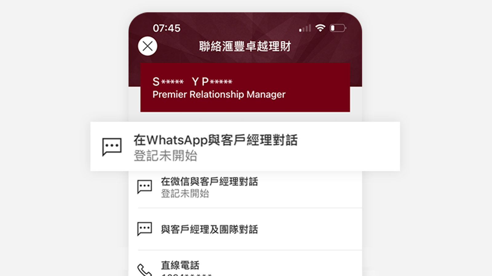登入HSBC HK App,並點選選單圖示。選擇「聯絡滙豐卓越理財尊尚」或「聯絡卓越理財」,再選擇「在WhatsApp與客戶經理對話」。