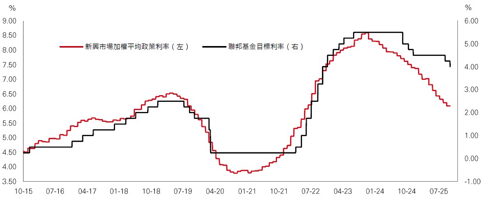 另一方面,新興市場形勢造好,其估值大幅折讓,這得益於聯儲局放寬政策帶來空間,讓新興市場央行可進一步減息。較低的美國利率亦可能使美元受壓,而美元為2025年至今新興市場回報的重要驅動因素。