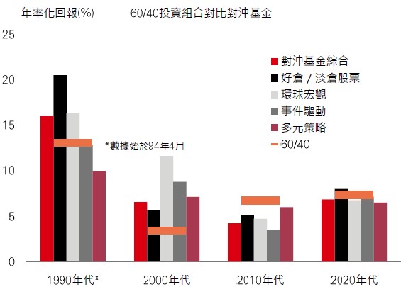 對沖基金便是選擇之一。這類資產不僅提供吸引回報(過去十年,表現媲美傳統60/40投資組合),與股票的關連性亦低於美國國庫券。無可否認,對沖基金在2010年代的表現未如理想,但當時宏觀波幅較低、股市分散度不高及利率極低,這些因素均對沖基金的表現帶來了挑戰。現時,宏觀和市場環境更接近1990和2000年代,我們會否即將迎來此資產類別的新黃金時代?