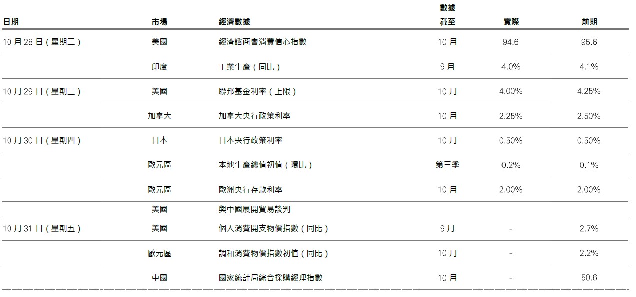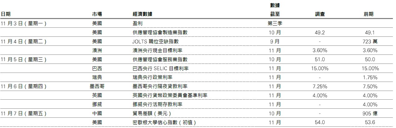 資料來源:滙豐投資管理。數據截至2025年10月31日(英國時間上午7時30分)。僅供參考,不應視為投資特定國家、產品、策略、行業或證券的建議。所表達的任何觀點均截至編製為止,如有更改,恕不另行通知。所提供的任何預測、預計或目標僅供參考,概非任何形式保證。滙豐投資管理對未能達到該預測、預計或目標,概不承擔任何責任。*美國政府持續停擺可能推遲官方數據公布