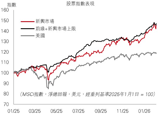 2025年前緣股市以美元計升近40%,跑贏成熟市場外,亦與新興市場的表現相若,但走勢更為平順,波幅更低,其部分原因是受到美元回軟支持。此外,去年環球股市表現開始擴展亦有利前緣市場,投資者受到基本因素持續改善、結構性因素吸引和波幅較低所吸引。
