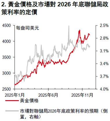 展望後市,鮑威爾(Jerome Powell)的任期將於2026 年5 月結束,下一任聯儲局主席的任命將是影響市場的關鍵因素。新任命者不太可能促使明顯鷹派的政策轉變,這將導致美元在2026 年處於守勢,有利黃金走勢(圖2)。此外,持續存在的地緣政治、財政和經濟政策風險或會持續給黃金帶來上行壓力,儘管我們的貴金屬分析師預計,隨著供需動態的變化,2026 年下半年波動將會加劇且價格會有所回落。
