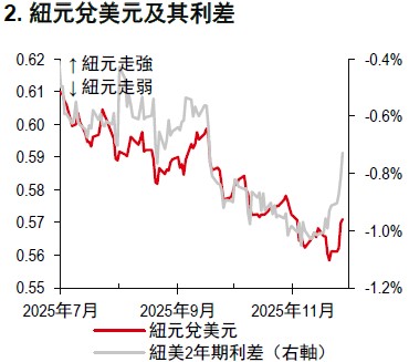 11 月26 日,正如市場普遍預期,紐西蘭央行將政策利率下調25 個基點(即0.25%)至2.25%。該央行的政策利率預測顯示,政策利率將再次小幅下調5 個基點(即0.05%),預計到2026 年6 月,利率將降至最低水準。行長霍克斯比(Christian Hawkesby)指出,這意味著2026 年利率將保持穩定。紐西蘭央行強調,2024 年8 月以來大幅減息325 個基點(即3.25%)的措施正在帶動需求上升,且失業率已經見頂。在消息公佈後,受利率走勢推動,紐元兌美元大幅上升(圖2)。