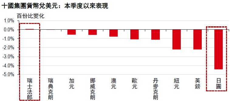在第四季,瑞士法郎是表現最強的十國集團貨幣,美元緊隨其後。相比之下,同為避險貨幣的日圓表現最弱。這種分化走勢引發市場關注:為何同為避險資產卻表現迥異以及這一趨勢會否延續?