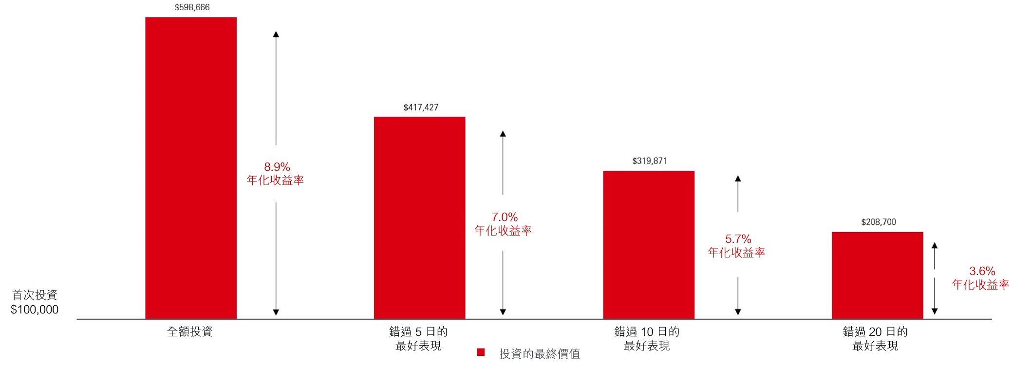 自 2005 年以來 100,000 美元的股票投資,錯過市場最佳表現的 20 天,最終投資價值從大約 598,000美元減少至 208,700美元。